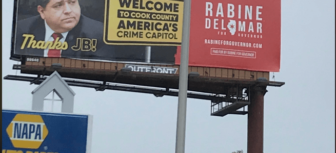 Photo: Rabine for Governor billboard which welcomes drivers to Cook County, "America's Crime Capitol", at North Ave and Villa Ave in Villa Park (not particularly close to the county line).
